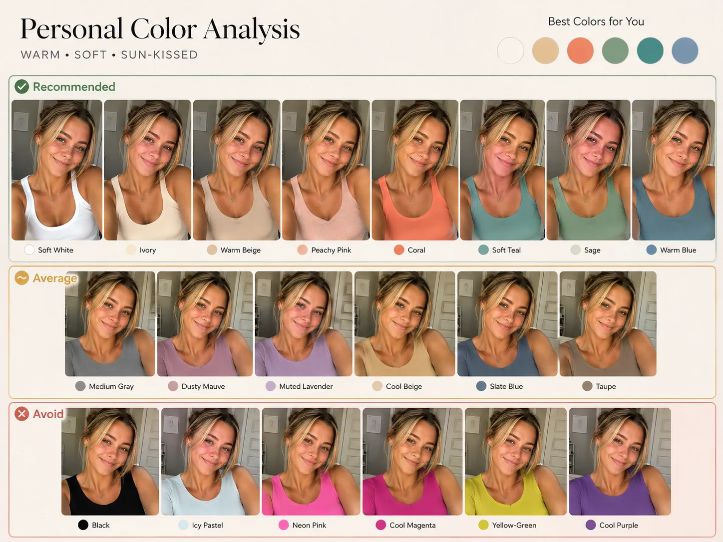 Upload a selfie and create a visual AI personal color analysis board with recommended, average, and avoid clothing colors.
