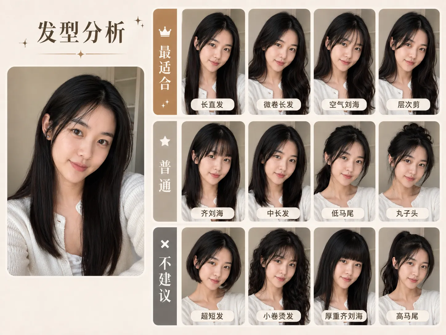 发型分析不是简单套一个滤镜,而是先根据你的自拍理解脸型比例、可见发质、发量、当前发型和打理需求,再生成一张可视化发型建议图。你可以在理发、烫染或换风格前,先比较哪些方向更适合自己。